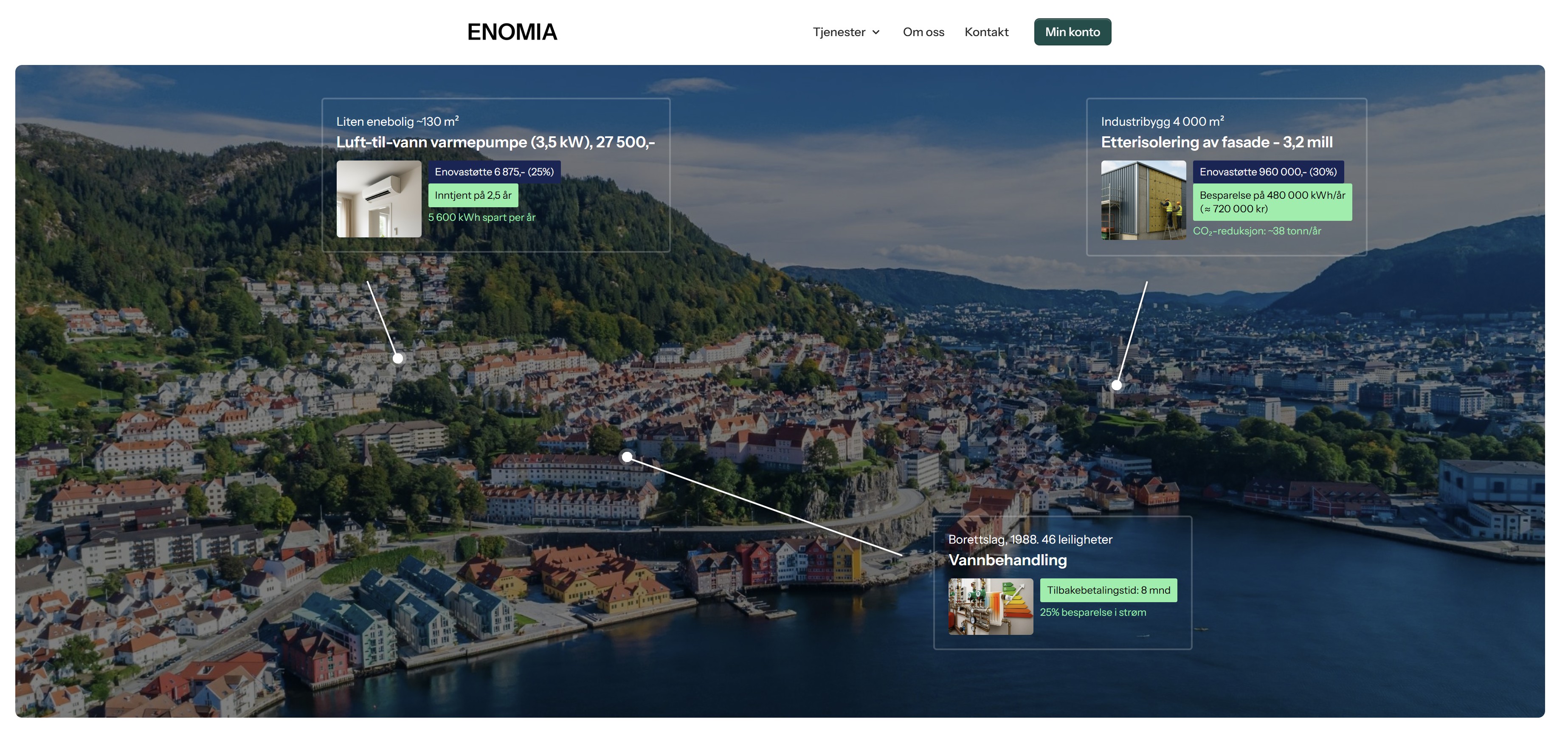 Mange snakker om miljø, men investeringer styres av økonomi. Uten insentiver som lavere driftskostnader, økt eiendomsverdi eller rask payback så skjer ikke endringene. Her gjør Enomia en forskjell: Vi effektiviserer hele reisen fra behov til ferdig tiltak, og vi synliggjør hvor mye man faktisk kan tjene på å velge riktig løsning. Ofte er det de små grepene som ventilasjon, lysstyring eller teknisk optimalisering – som gir størst effekt, men som altfor ofte blir oversett.